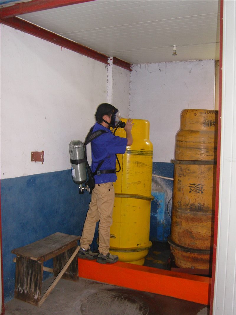人員佩戴配備防毒面罩和空氣呼吸器對液氨泄露事故進(jìn)行演練